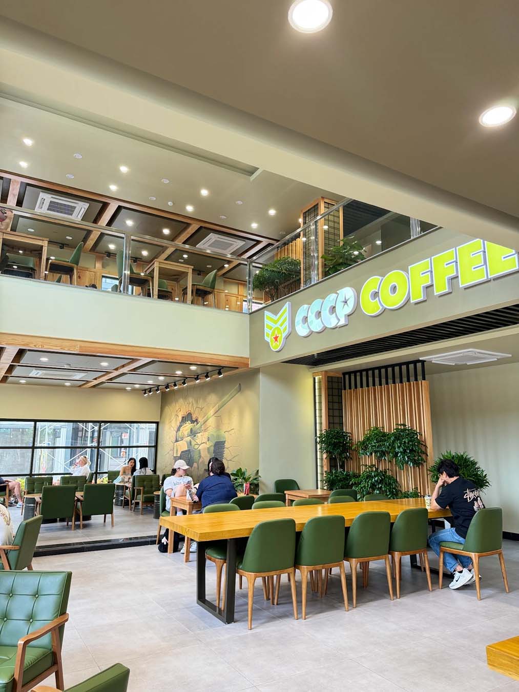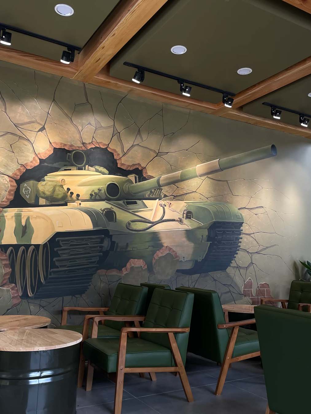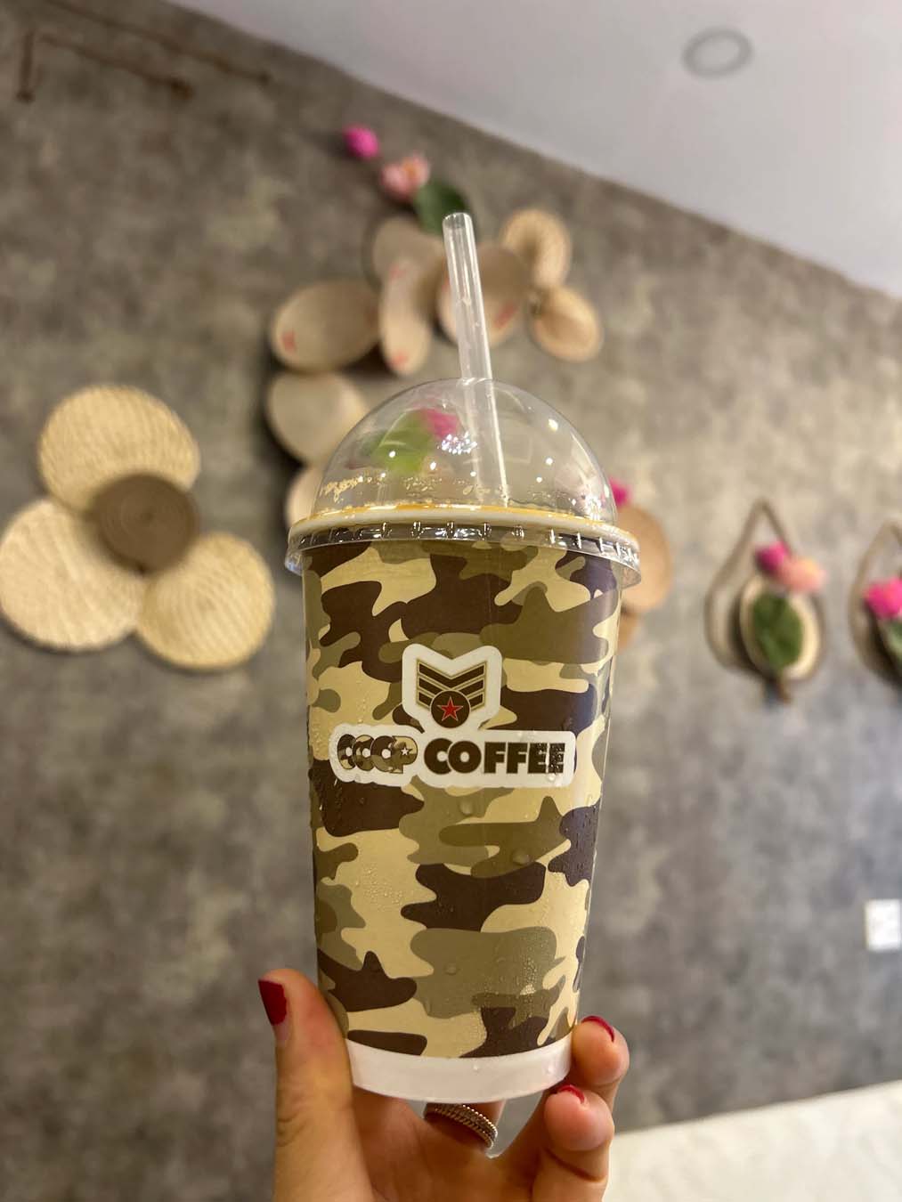 Không gian quán được thiết kế như một “căn cứ quân sự” thu nhỏ, với tông màu rằn ri, xanh lính và gỗ mộc. Trên tường nổi bật là bức tranh 3D xe tăng lao xuyên tường cực kỳ ấn tượng – một chi tiết khiến ai đến cũng phải dừng lại chụp ảnh. Bên trong có khu máy lạnh yên tĩnh, tầng trên phù hợp làm việc hoặc học nhóm, tầng trệt rộng rãi cho các buổi gặp gỡ bạn bè. Dàn nhân viên mặc đồng phục quân đội, phục vụ nhanh nhẹn, thân thiện – tất cả góp phần tạo nên phong cách đặc trưng của cà phê Đà Nẵng mang đậm dấu ấn Xô Viết.