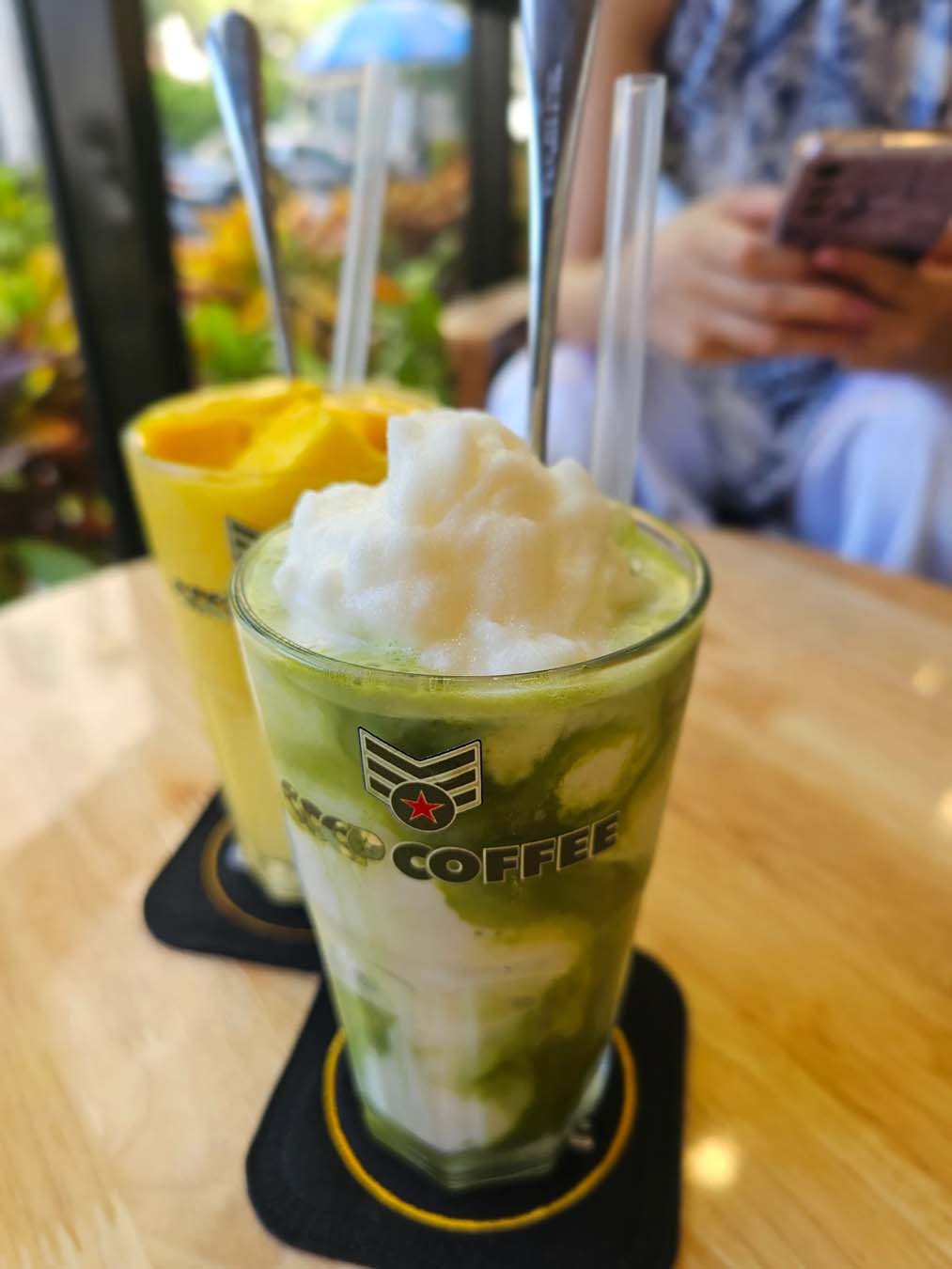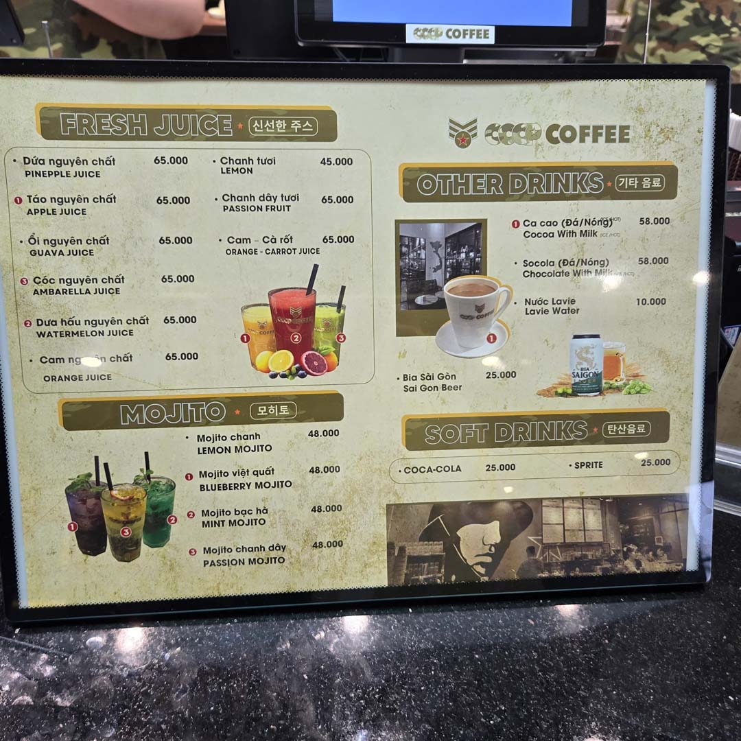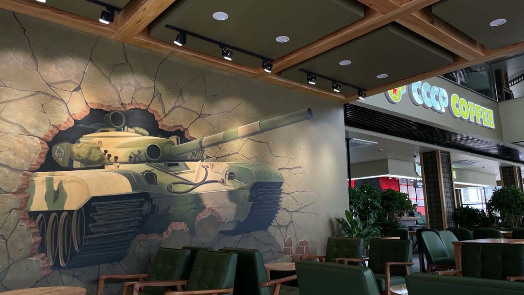 Không gian quán được thiết kế như một “căn cứ quân sự” thu nhỏ, với tông màu rằn ri, xanh lính và gỗ mộc. Trên tường nổi bật là bức tranh 3D xe tăng lao xuyên tường cực kỳ ấn tượng – một chi tiết khiến ai đến cũng phải dừng lại chụp ảnh. Bên trong có khu máy lạnh yên tĩnh, tầng trên phù hợp làm việc hoặc học nhóm, tầng trệt rộng rãi cho các buổi gặp gỡ bạn bè. Dàn nhân viên mặc đồng phục quân đội, phục vụ nhanh nhẹn, thân thiện – tất cả góp phần tạo nên phong cách đặc trưng của cà phê Đà Nẵng mang đậm dấu ấn Xô Viết.
