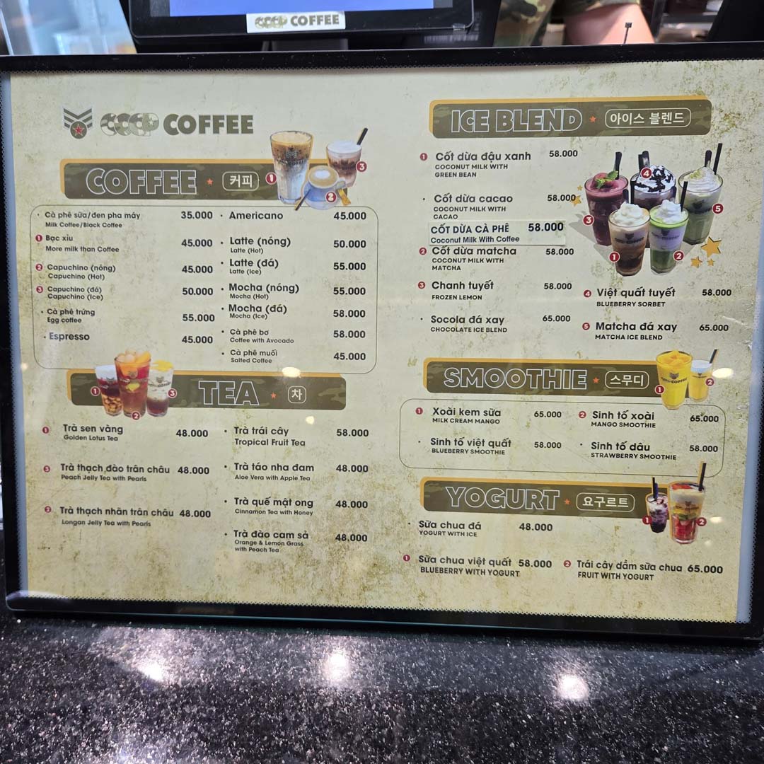 Menu của CCCP Coffee đa dạng với cà phê truyền thống, cà phê đá xay, trà trái cây, mojito, sữa chua dầm và bánh ngọt. Món cà phê dừa được xem là “best-seller”, thơm mượt và béo ngậy, rất hợp với khí hậu Đà Nẵng. Ngoài ra, sinh tố xoài, soda việt quất hay chocolate đá xay kem tươi cũng được khách hàng yêu thích. Quầy bánh croissant, caramel apple hay salted egg croissant được trưng bày bắt mắt, ăn kèm cà phê cực kỳ hợp vị.