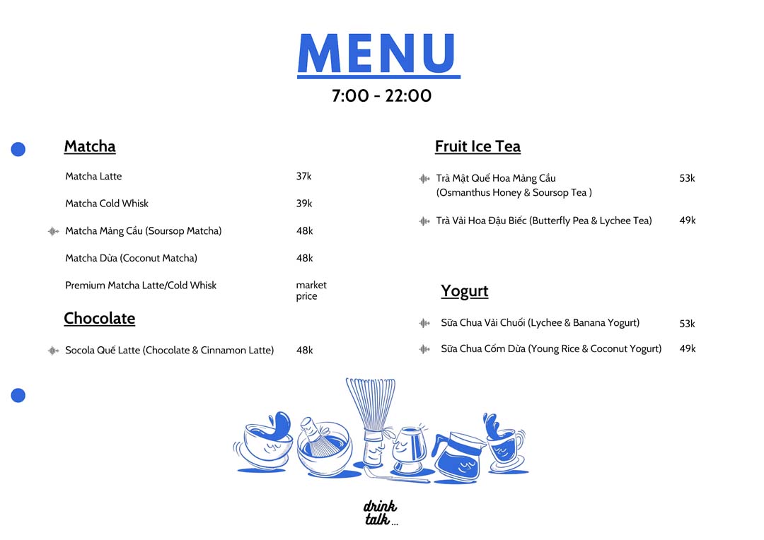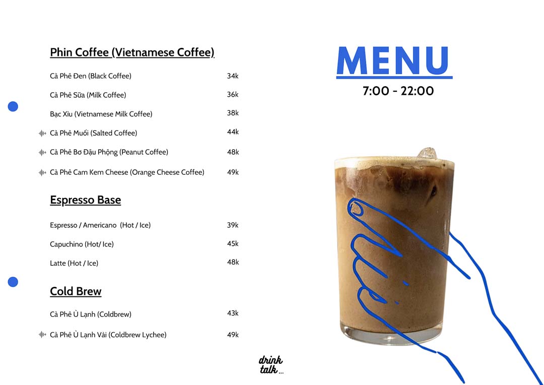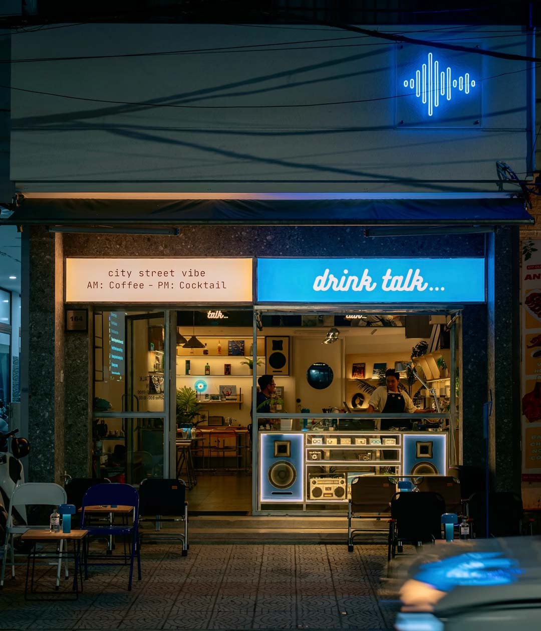 Drink Talk vận hành theo mô hình một không gian hai mood. Ban ngày từ 07:00 đến 18:00, quán phục vụ menu cà phê cơ bản, matcha và các món nước nhẹ nhàng với mức giá tầm trung, phù hợp để làm việc hoặc trò chuyện. Khi thành phố lên đèn từ 18:00 đến 01:30, nơi đây chuyển mình thành một điểm chill đúng nghĩa với mocktail và cocktail đa tầng hương vị, đủ để bạn lai rai và mở nhịp câu chuyện cùng bạn bè.