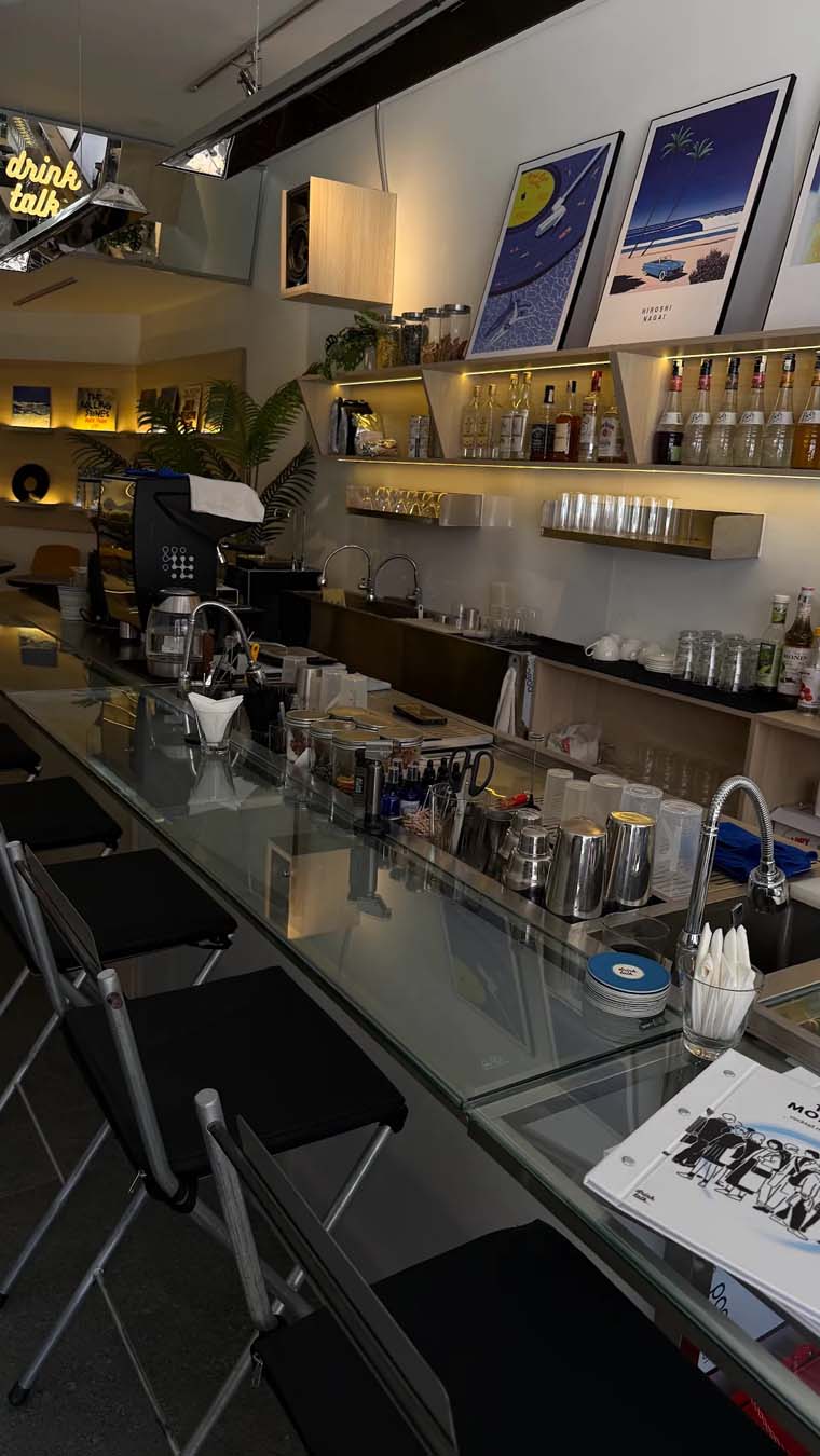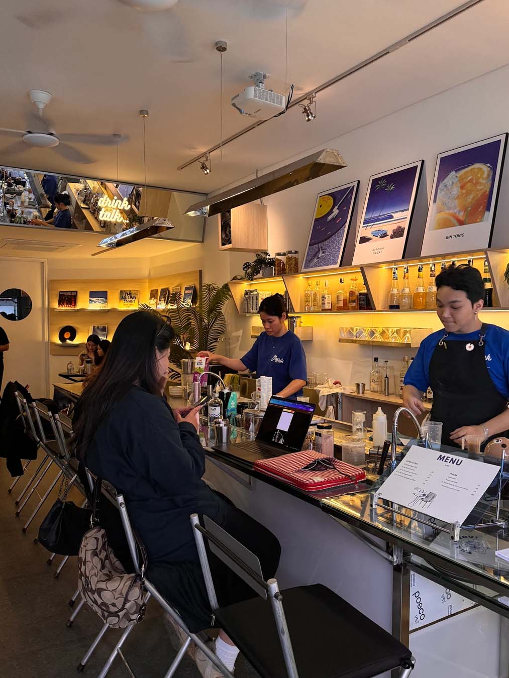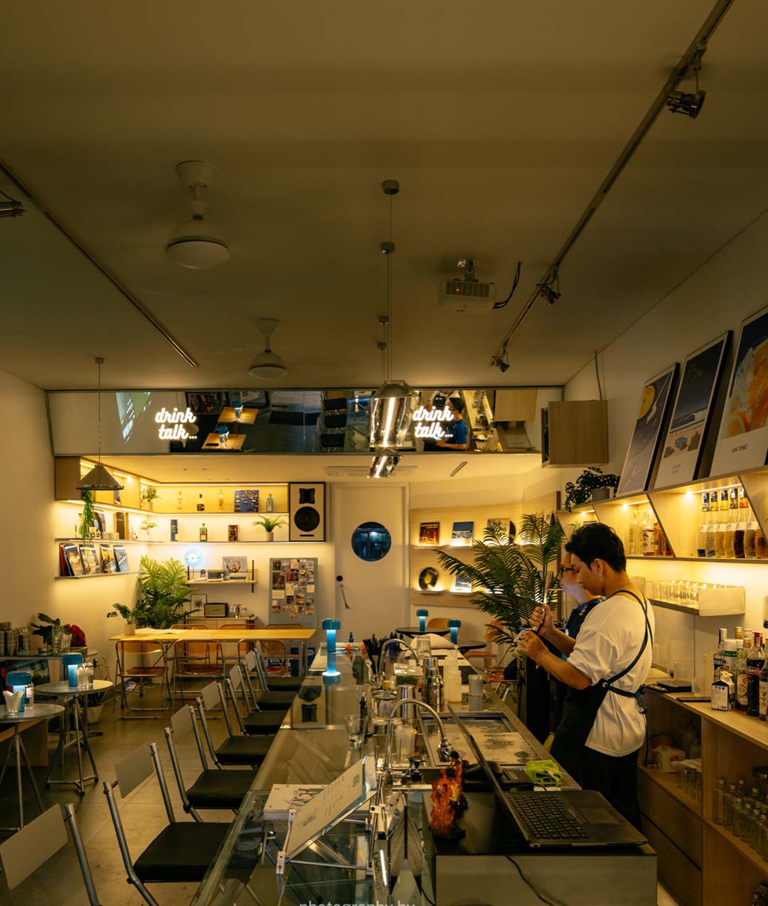 Không quá rộng nhưng Drink Talk tận dụng tốt từng mét vuông để tạo nên một không gian gọn gàng và có chiều sâu. Mặt tiền mở ra phố với dãy ghế xếp đơn giản, tạo cảm giác gần gũi đúng kiểu city street vibe. Bên trong, quầy bar kéo dài với mặt kính, ánh đèn vàng ấm và kệ trưng bày được sắp xếp chỉn chu khiến tổng thể vừa hiện đại vừa có chút chất “studio” của dân yêu sáng tạo.