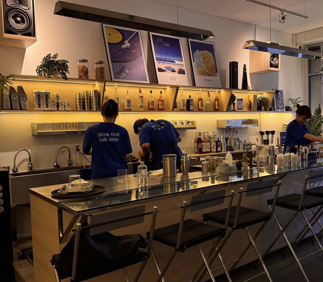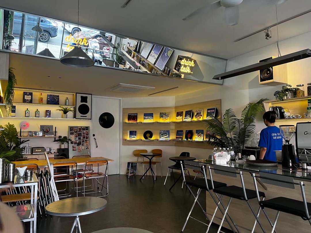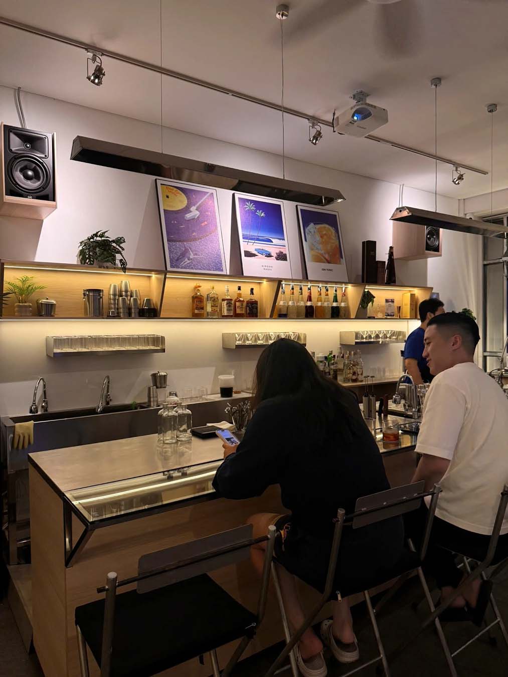 Không quá rộng nhưng Drink Talk tận dụng tốt từng mét vuông để tạo nên một không gian gọn gàng và có chiều sâu. Mặt tiền mở ra phố với dãy ghế xếp đơn giản, tạo cảm giác gần gũi đúng kiểu city street vibe. Bên trong, quầy bar kéo dài với mặt kính, ánh đèn vàng ấm và kệ trưng bày được sắp xếp chỉn chu khiến tổng thể vừa hiện đại vừa có chút chất “studio” của dân yêu sáng tạo.