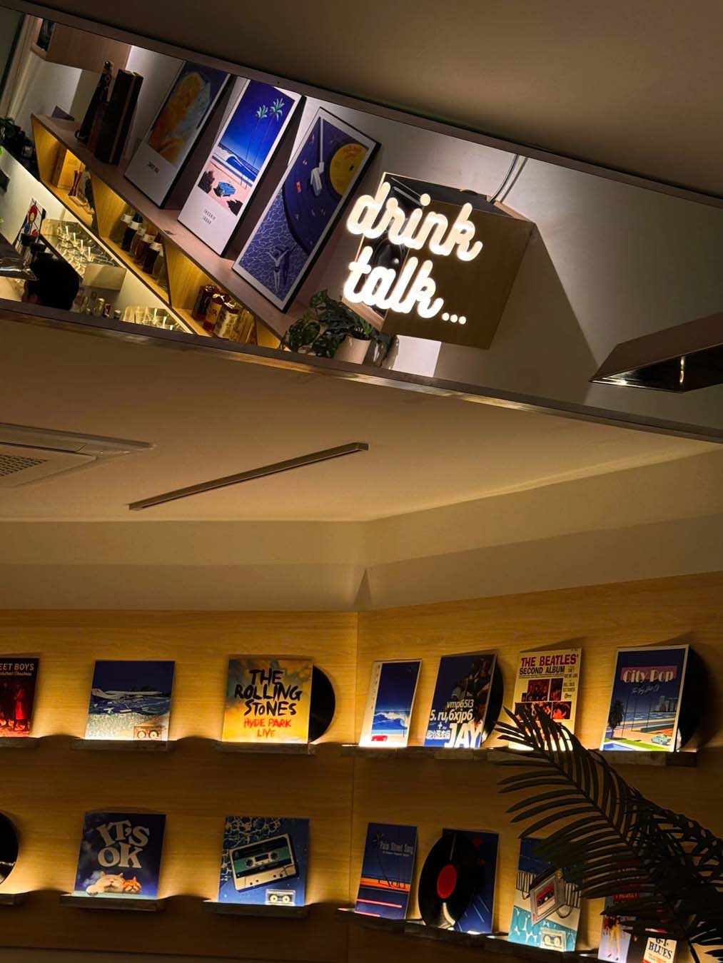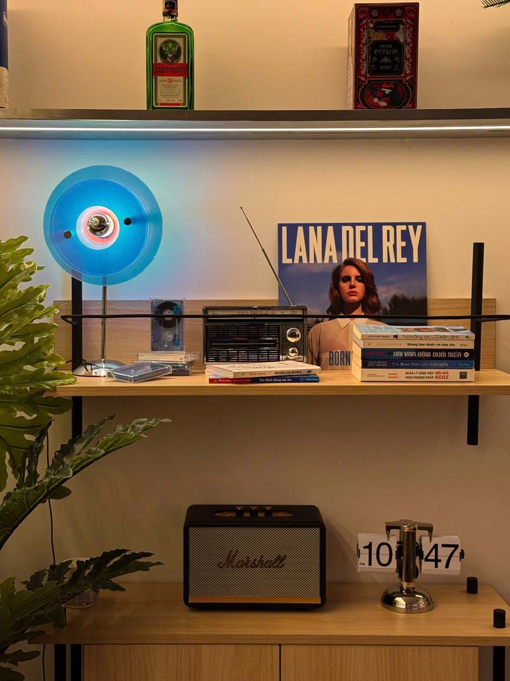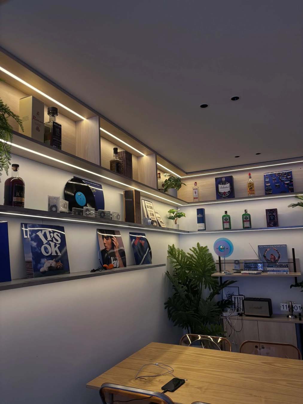 Tinh thần âm nhạc hiện diện rõ ràng trong từng góc nhỏ. Những chiếc đĩa vinyl, băng cassette, poster album, loa thùng và cả các chai rượu được trưng bày như một bộ sưu tập có chủ ý. Ánh sáng hắt từ hệ đèn âm tường làm nổi bật từng chi tiết decor, tạo cảm giác ấm áp nhưng vẫn đủ cá tính. Sự kết hợp giữa chất retro và đường nét tối giản giúp không gian vừa gợi hoài niệm, vừa bắt kịp gu thẩm mỹ của người trẻ đô thị.