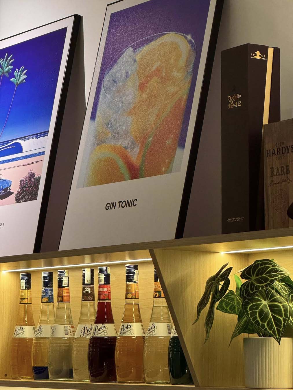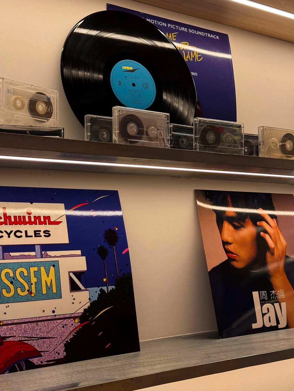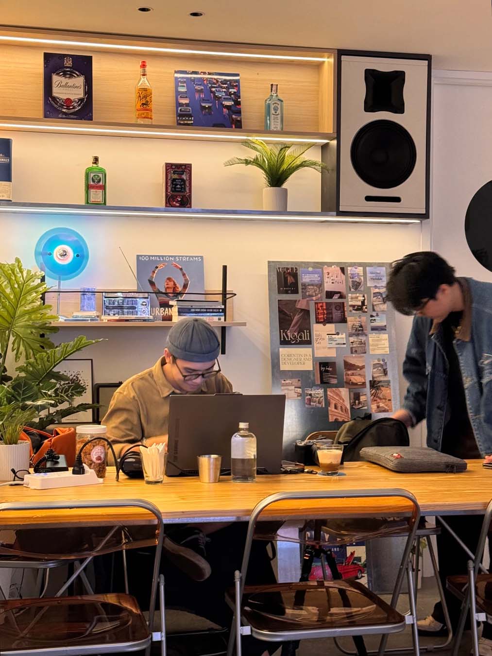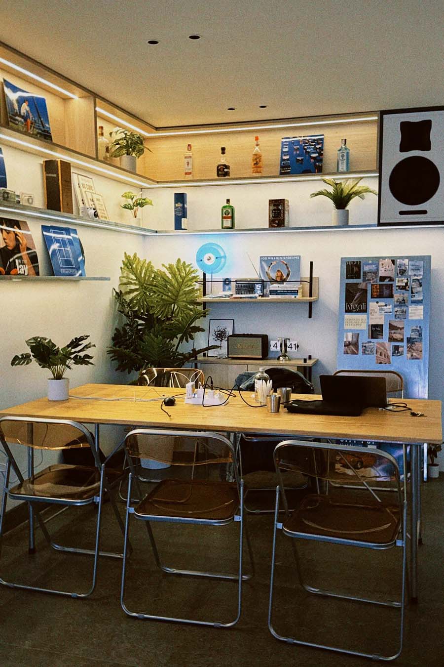 Tinh thần âm nhạc hiện diện rõ ràng trong từng góc nhỏ. Những chiếc đĩa vinyl, băng cassette, poster album, loa thùng và cả các chai rượu được trưng bày như một bộ sưu tập có chủ ý. Ánh sáng hắt từ hệ đèn âm tường làm nổi bật từng chi tiết decor, tạo cảm giác ấm áp nhưng vẫn đủ cá tính. Sự kết hợp giữa chất retro và đường nét tối giản giúp không gian vừa gợi hoài niệm, vừa bắt kịp gu thẩm mỹ của người trẻ đô thị.