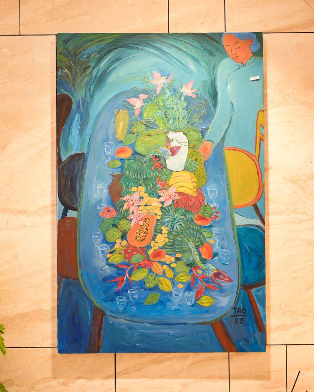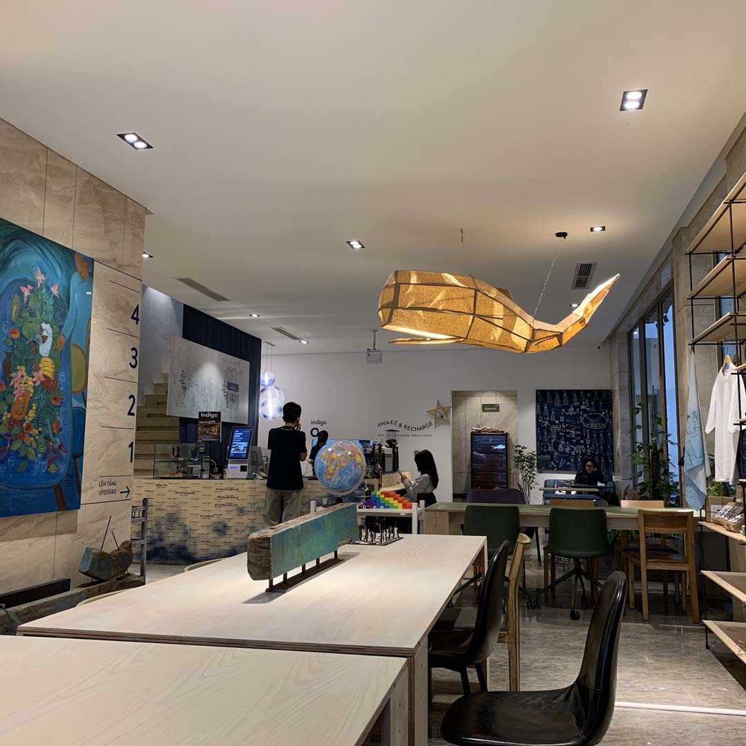 Điểm nhấn đặc biệt của Indigo Highlight nằm ở câu chuyện tái chế và thủ công, được kể bằng những chi tiết rất đời: chiếc đèn cá nhà táng làm từ giấy vụn công trình, đệm ghế và lót cốc từ vải jean tái chế, hay những mảnh gỗ thừa, mặt bàn vỡ, cốc giấy đã qua sử dụng được “thổi hồn” thành một phần của không gian mới. Tất cả tạo nên một trải nghiệm sáng tạo, gần gũi và đầy cảm hứng.