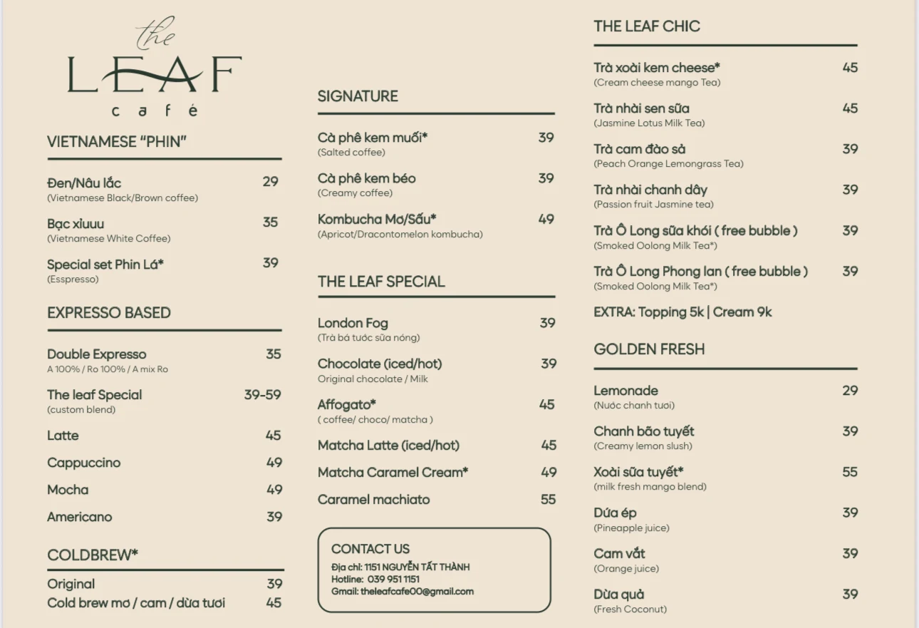 Với cách tiếp cận không gian mở và phong cách nhẹ nhàng, The Leaf Cafe dần trở thành điểm hẹn cho những ai yêu sự mộc mạc, đề cao cảm xúc và có gu thưởng thức riêng. Dù ghé vào ban ngày hay quay lại vào buổi tối, quán vẫn giữ được nét phóng khoáng và nhịp điệu dễ chịu, đủ để người ta muốn ở lại lâu hơn.